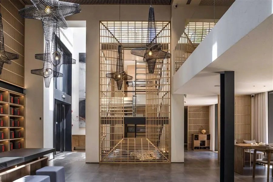 The combination of indoor lighting and interior decoration creates a unified and coordinated atmosphere.For example, irregular arrays of special-shaped wire mesh lamps hang from the empty roof, and thin grilles descend from the ceiling like a waterfall. As the background of the bar tea table, the brushstrokes are concise and powerful.